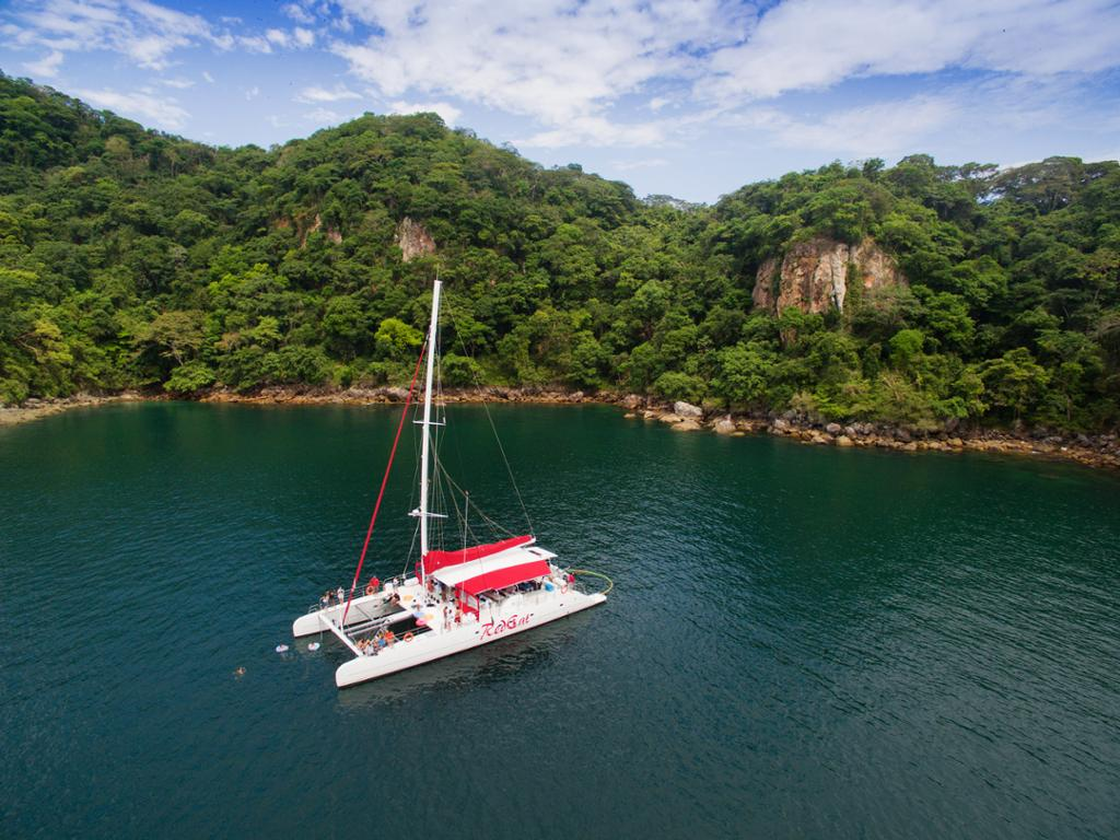 Enjoy the breathtaking views of the Panama city skyline, Cinta Costera and ships waiting to cross Panama Canal, until you reach the Island of Taboga on a 45 minutes ride; During this time light snacks will be served. After reaching Taboga we sail to the back side of the Island, our secret spot, an amazing bay with beautiful natural views, where you will have the opportunity to jump off the boat and have your first swim! We also have a stair with direct access to the water. Climb back into the boat to enjoy a cold beer while we sail to the main side and make our second stop on the town side, where you'll be provided with transportation to the beach and be able to visit the small village of Taboga. You can also relax in the catamaran's big nets, enjoy the sun, swim or use our floating noodles. You will be able to jump from the boat to the water too. After the town visit, lunch will be served on board of the catamaran and later, we'll sail back to port. If the wind is favorable during our way back the sails will be opened and the party continue.