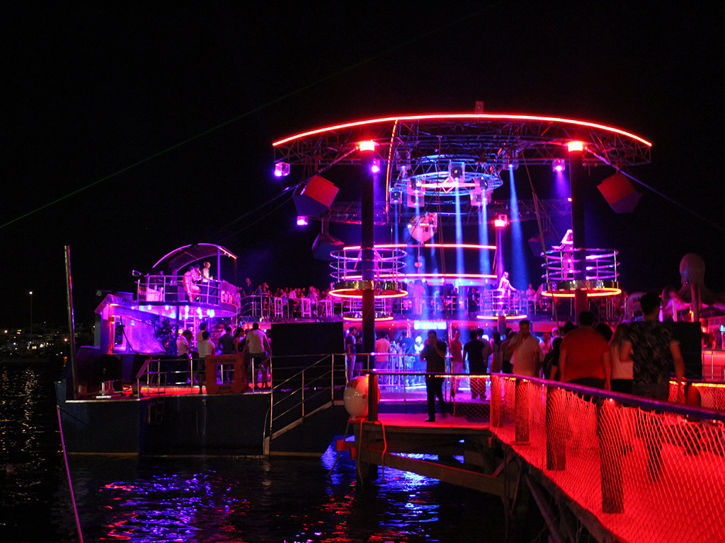 After 10 pm, on the port, among the Turkish and foreign visitors sipping their first drinks prepared by the master barmen and barmaids are frequently the stars of the television, cinema, music and jet set circle. As the rhythm of the night and music picks up speed around past midnight, the party people get ready to groove whole night on the transparent dance floor just above the fishes, and they start to leave the port to flock the boat. The party boat leaves the shore with its four bars in different concepts, VIP booths, customary dance shows, glamorous dancers and famous DJs and the night gets fired up and the dance aboard begins.