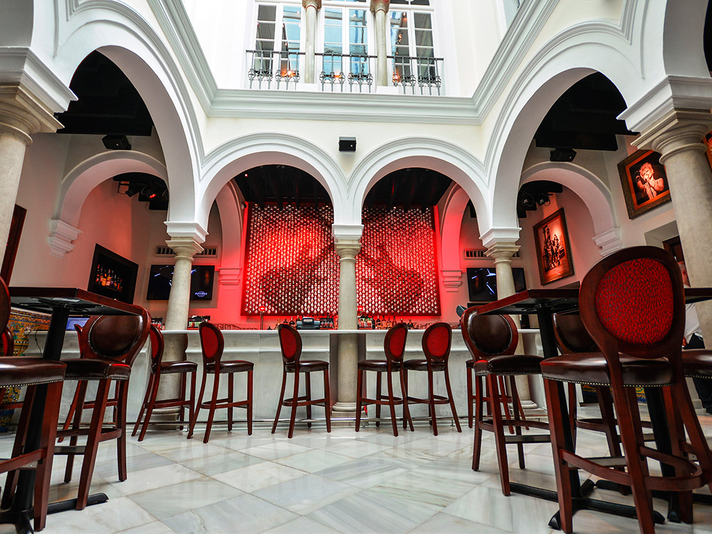 Hard Rock Cafe Seville is located in a beautiful building that was constructed with historical values in mind. The multi-level Cafe includes indoor seating over two floors, an upscale vibrant atrium bar and a Rock Shop. Taking inspiration from local architecture, using traditional Sevillian materials and finishes throughout the design, the highlights are its prominent arches, compelling ceramic tiles and wooden fixtures.